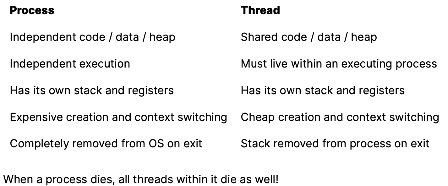 - Threads have lower overheads for creation and context switching
